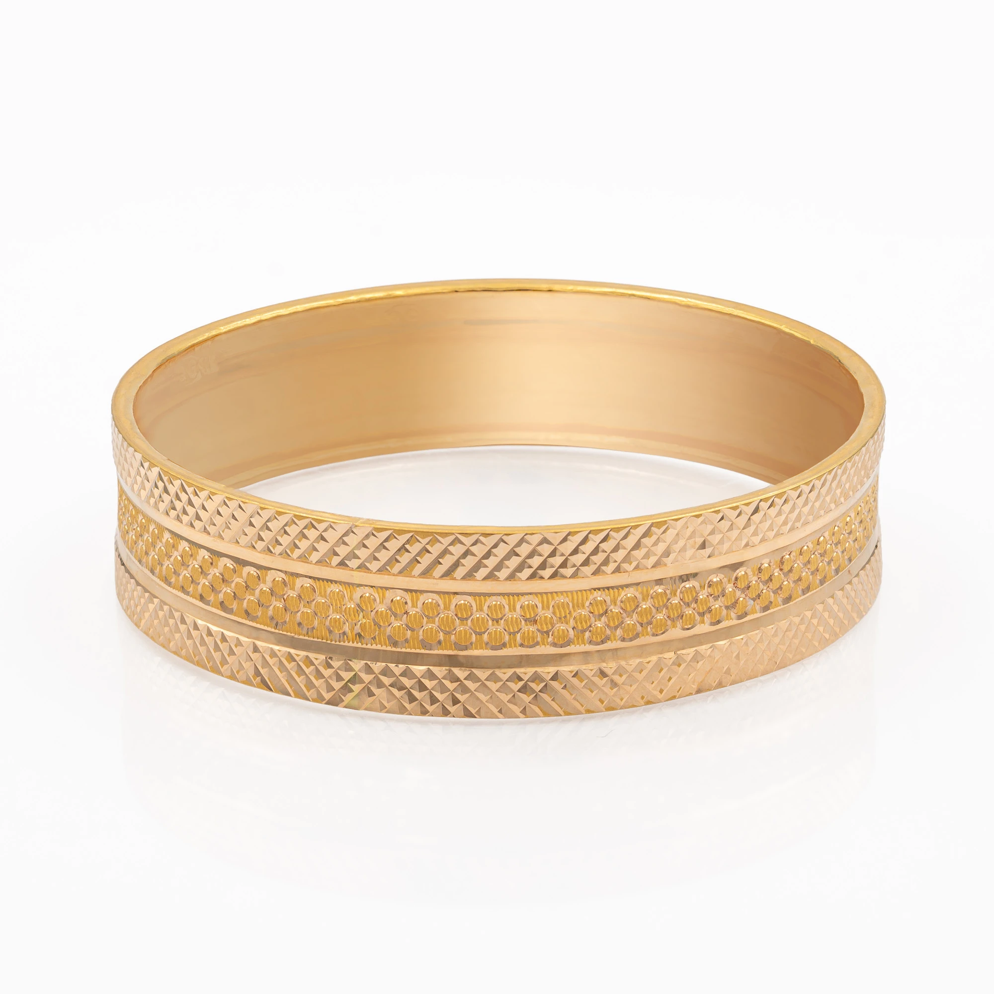 بناجر بحريني عريض بناجر الذهبية الفاخرة، المصممة بدقة عالية تجمع بين البساطة والرقي. يتميز السوار بنقوش محفورة بإتقان مع شريط وسطي مزيّن بتفاصيل بارزة تمنحه لمعانًا مميزًا وجاذبية ملفتة.