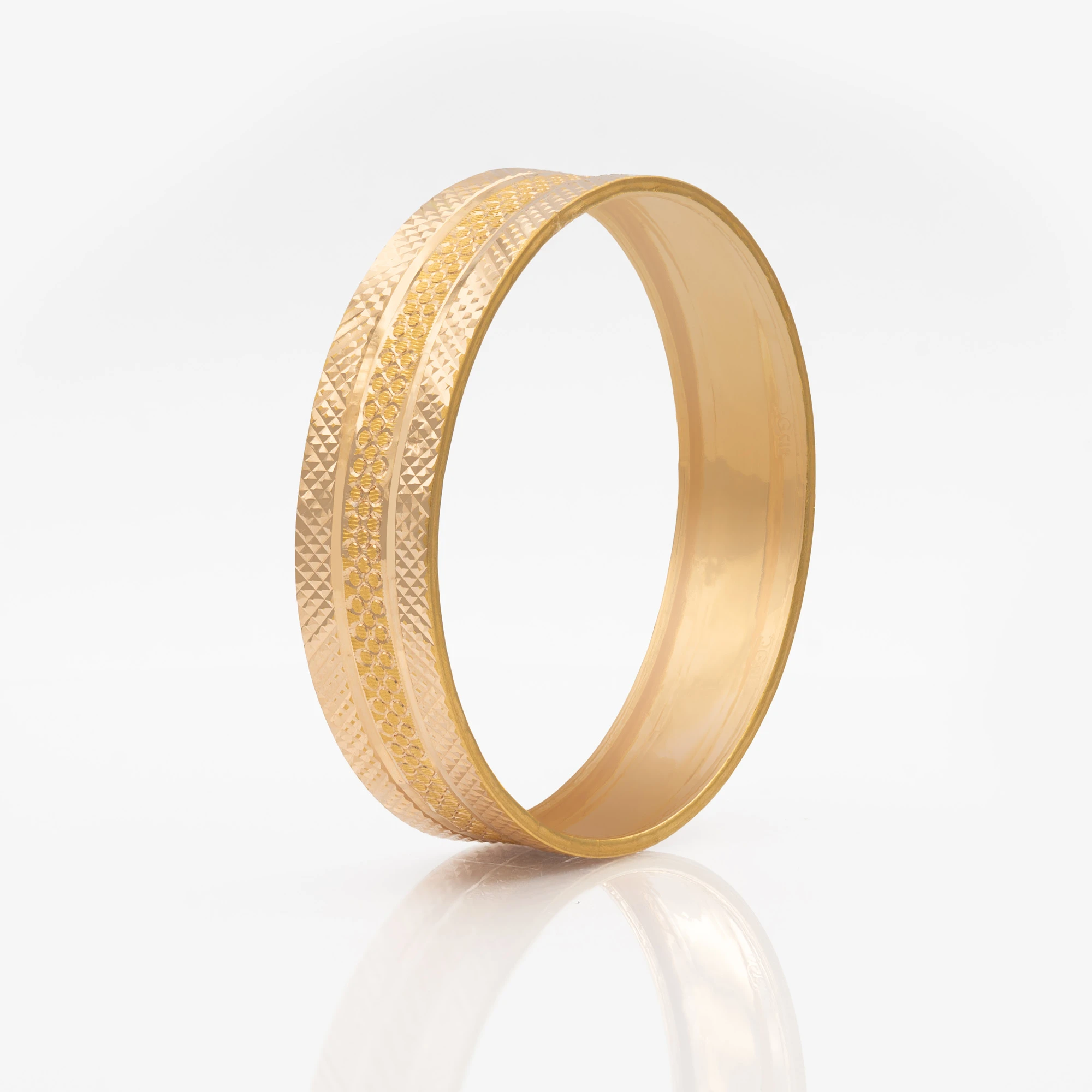 بناجر بحريني عريض بناجر الذهبية الفاخرة، المصممة بدقة عالية تجمع بين البساطة والرقي. يتميز السوار بنقوش محفورة بإتقان مع شريط وسطي مزيّن بتفاصيل بارزة تمنحه لمعانًا مميزًا وجاذبية ملفتة.
