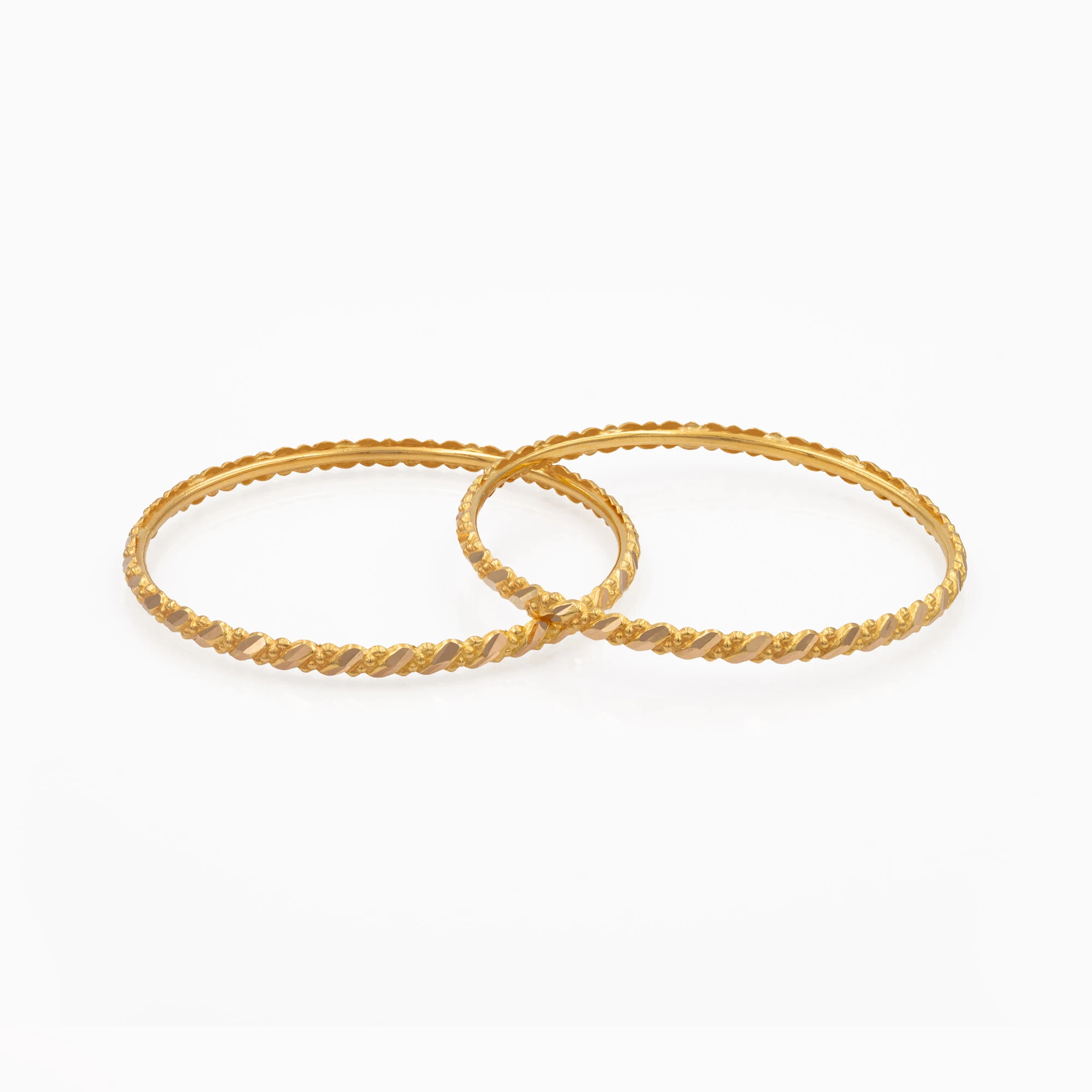 بناجر مبرومة ذات تصميم بسيط وأنيق. تتميز الإسوارة بلون ذهبي لامع، مع نقشة دقيقة من نقاط صغيرة متكررة تمتد على طول الحافة الخارجية، مما يمنحها ملمسًا وزخرفة هادئة بدون مبالغة. الإسوارة ذات شكل دائري منتظم وسطح مصقول يعكس الضوء بشكل جميل