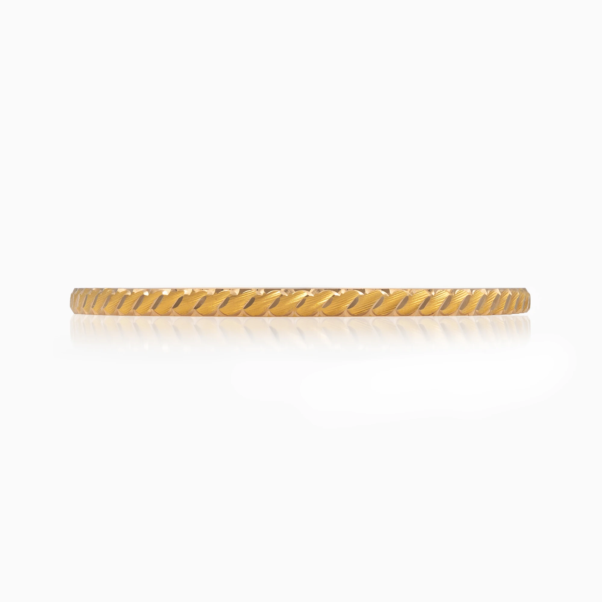 بناجر مبرومة ذات تصميم بسيط وأنيق. تتميز الإسوارة بلون ذهبي لامع، مع نقشة دقيقة من نقاط صغيرة متكررة تمتد على طول الحافة الخارجية، مما يمنحها ملمسًا وزخرفة هادئة بدون مبالغة. الإسوارة ذات شكل دائري منتظم وسطح مصقول يعكس الضوء بشكل جميل